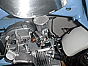 オリジナル・エアーフィルター・ケースをあきらめ(オイルの一方通行であふれたり、吸気にオイルが混ざるのがイヤ・・・というか許せない!)、ファンネル風小型ケース製作。表面の金網の下にはフィルターが仕込んであります。